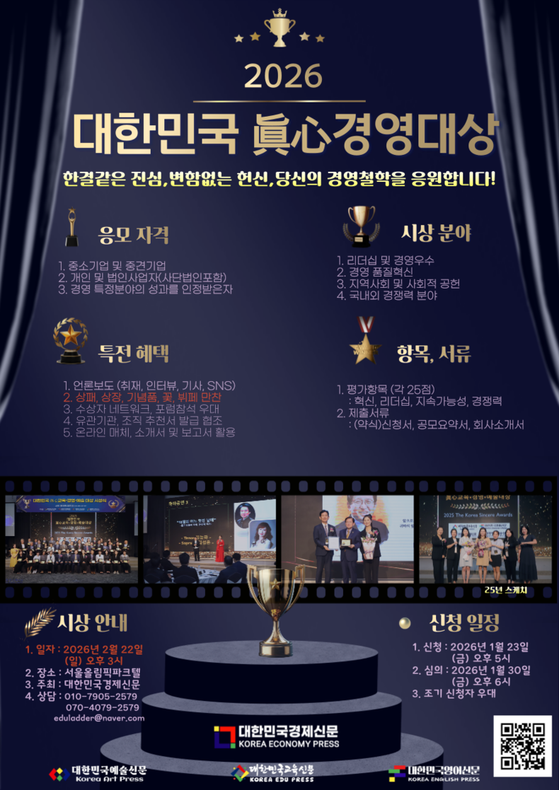 대한민국경제신문은 ‘진정성 있는 경영’을 실천해온 기관과 개인을 격려하기 위해 2026 대한민국 眞心경영대상 수상자를 공모한다.